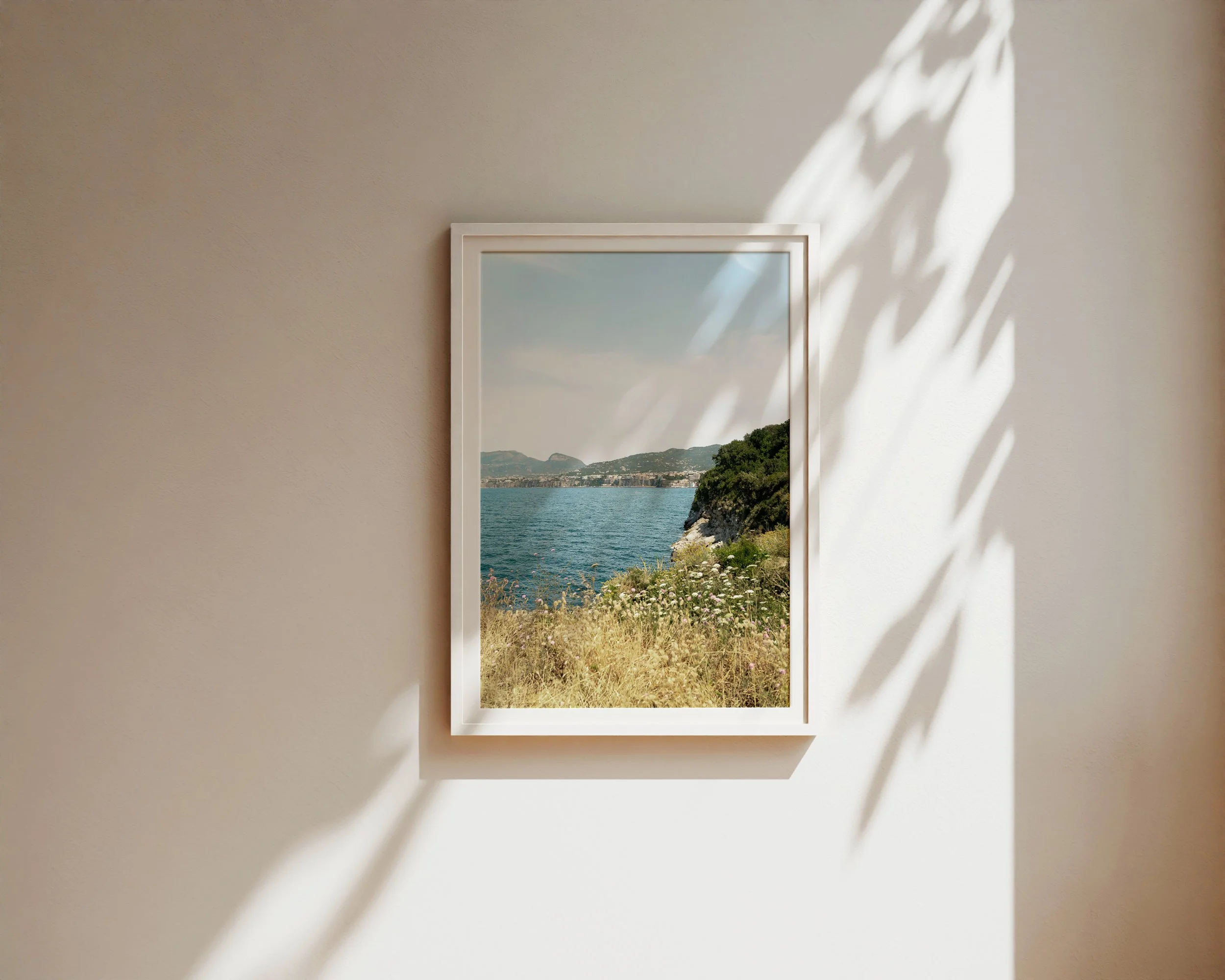 Framed photograph of a coastal cliff with golden dry grass and wildflowers overlooking a calm blue sea, with distant hills under a clear sky.