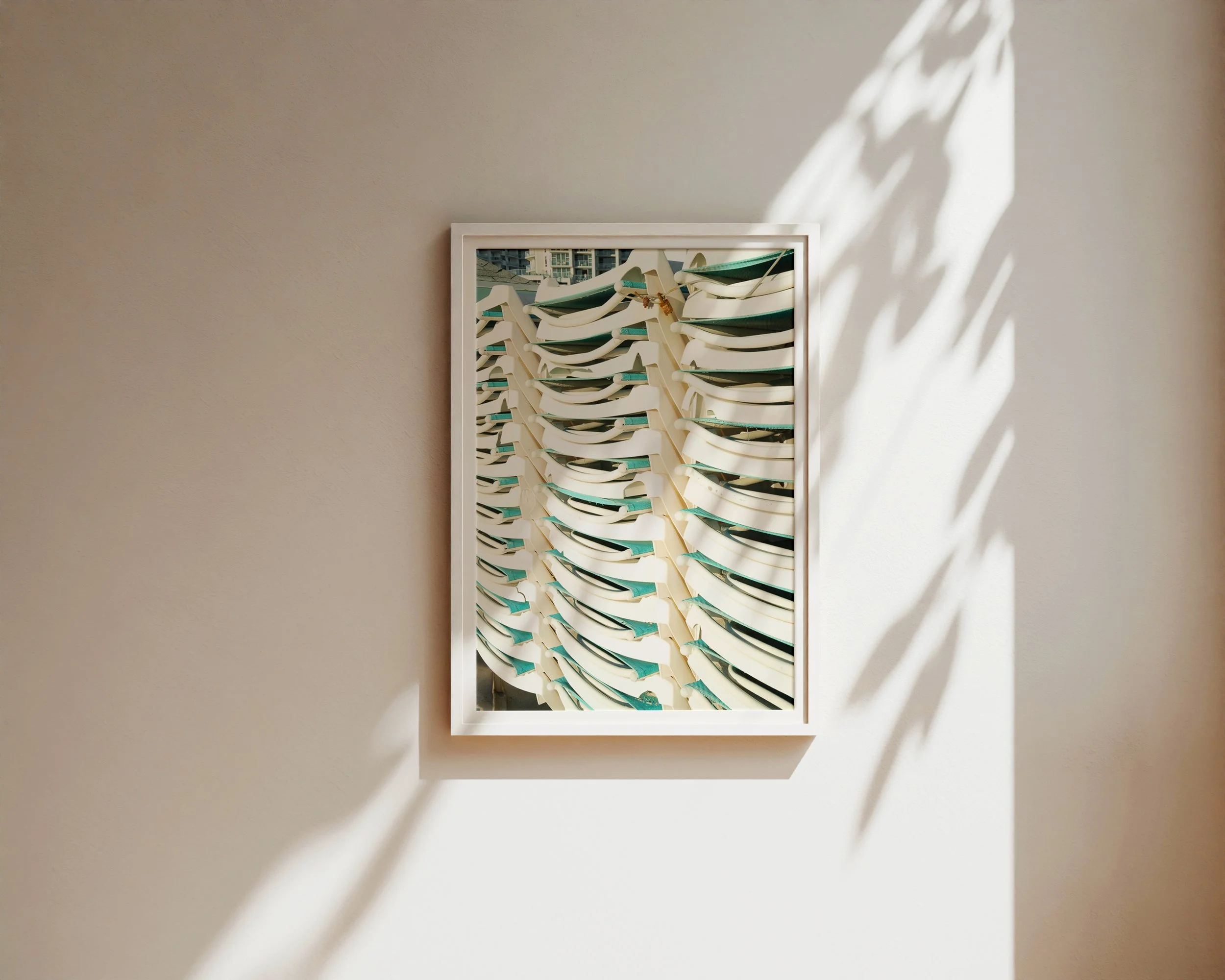 Stacked rows of white plastic lounge chairs with teal mesh fabric, arranged in a rhythmic, sculptural pattern and lit by bright coastal sunlight, with urban buildings faintly visible in the background.