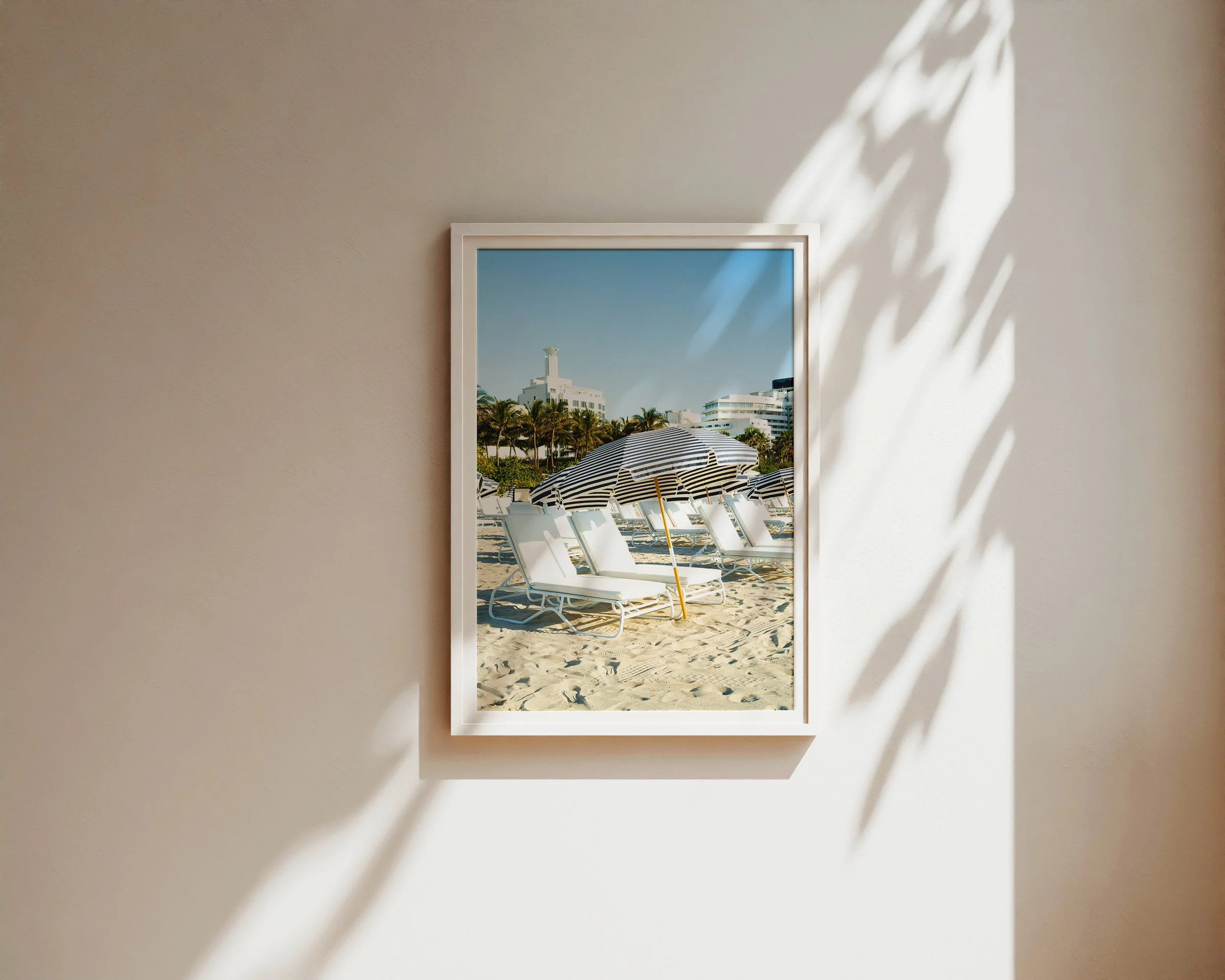 Rows of white lounge chairs and black-and-white striped umbrellas line a sunlit beach with fine sand. In the background, palm trees sway in front of white Art Deco buildings under a clear blue sky.