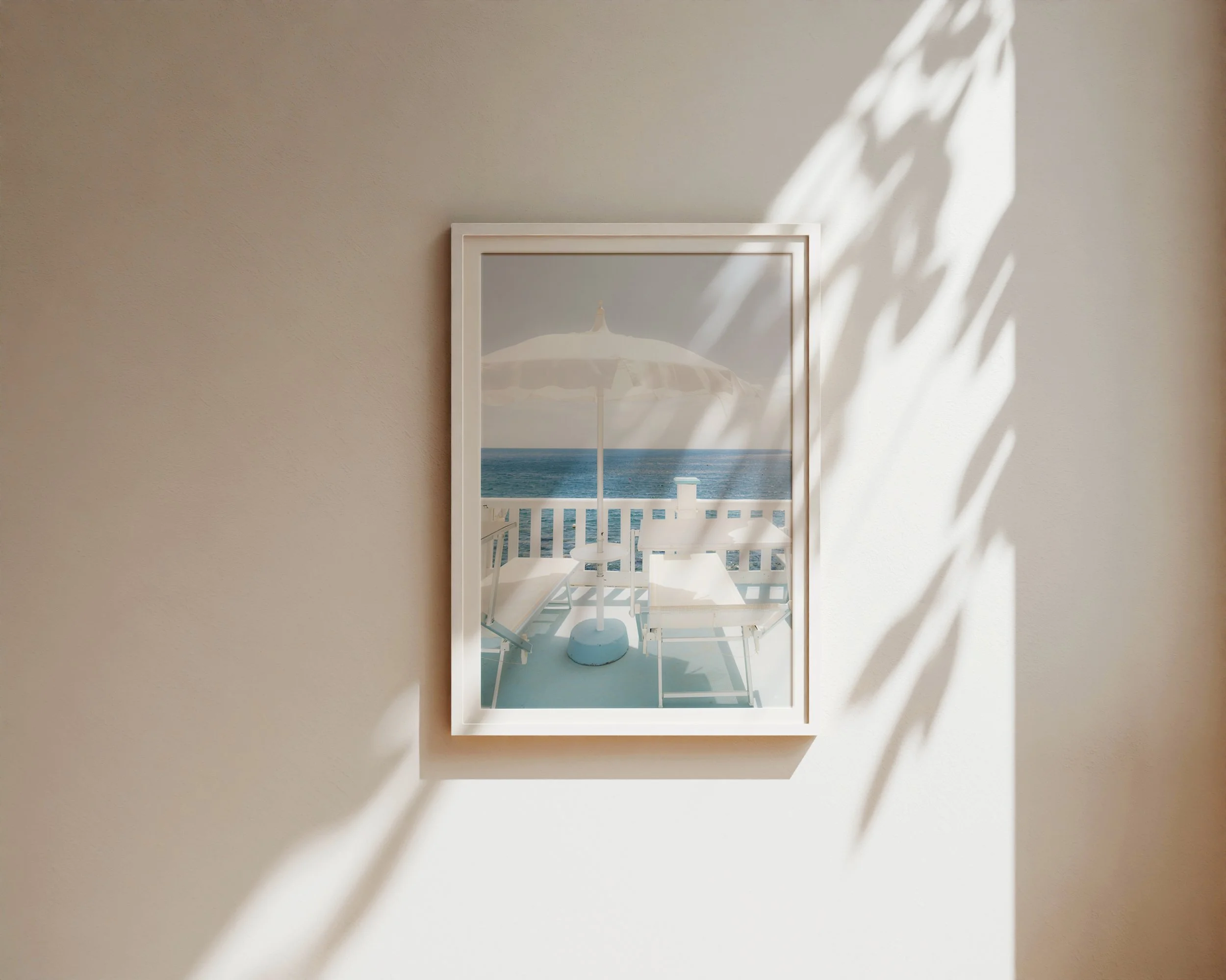 White lounge chairs and umbrella on a sunlit balcony overlooking a calm blue ocean, framed by a white railing under a hazy sky.